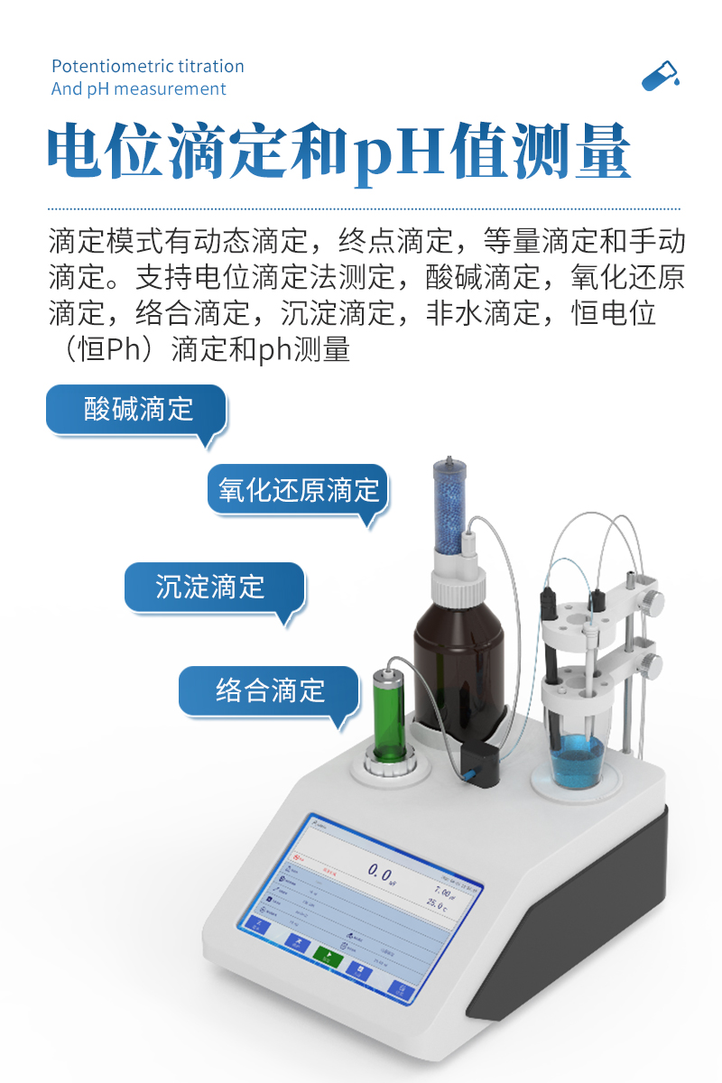 3. 滴定模式有動態滴定,終點滴定,等量滴定和手動滴定。支持電位滴定法測定,酸堿滴定,氧化還原滴定,絡合滴定,沉淀滴定,非水滴定,恒電位(恒Ph)滴定和ph測量。