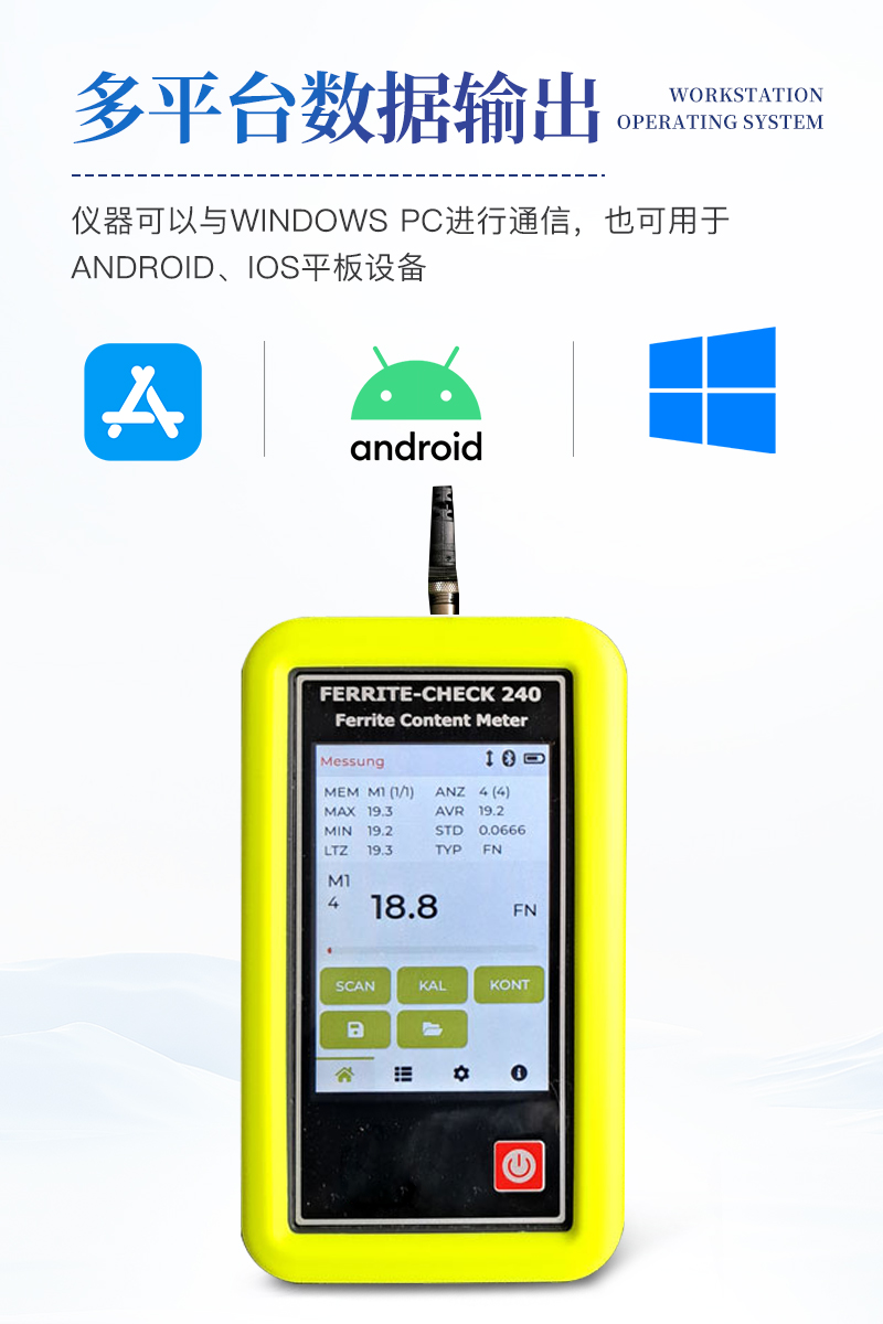 LCD彩色觸摸面板,操作方便,分辨率為320x480像素。帶橡膠保護(hù)套,顯示FN或Fe%的測(cè)量結(jié)果。