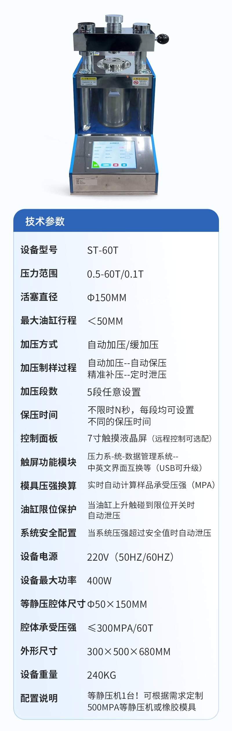 | 配置說明 | 等靜壓機1臺!可根據需求定制500MPa等靜壓機或橡膠模具 |