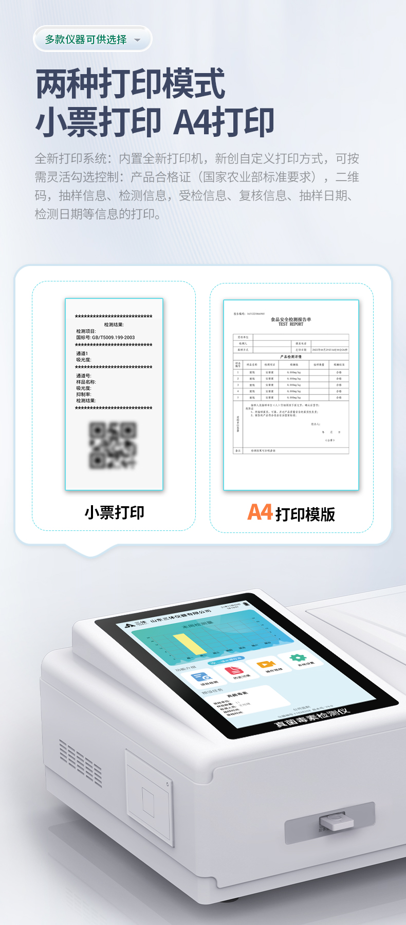 10、A4紙版本報告打印功能:設備擁有兩種結果展示方式,可以自動生成A4打印模板和小票打印模板兩種樣式,可通過WiFi及網線等方式鏈接外置打印機可進行打印