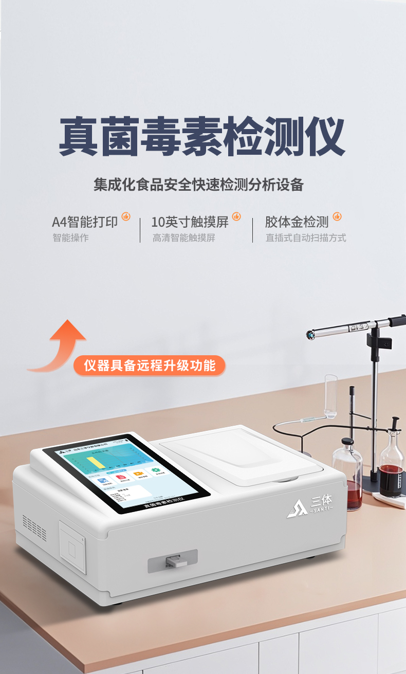 山東三體儀器有限公司生產的真菌毒素檢測儀應用競爭抑制免疫層析的技術原理,通過就是通過待檢測物與抗體結合的方法,分析待檢樣品中真菌毒素殘留。可快速檢測糧食、飼料、谷物、食用油、調味品中如玉米、大米、小麥、大麥、糙米、麩皮、稻谷、豆粕、米糠、飼料中的黃曲霉毒素B1、M1、總量,玉米赤霉烯酮、嘔吐毒素、T2毒素、赭曲霉毒素、伏馬毒素等。