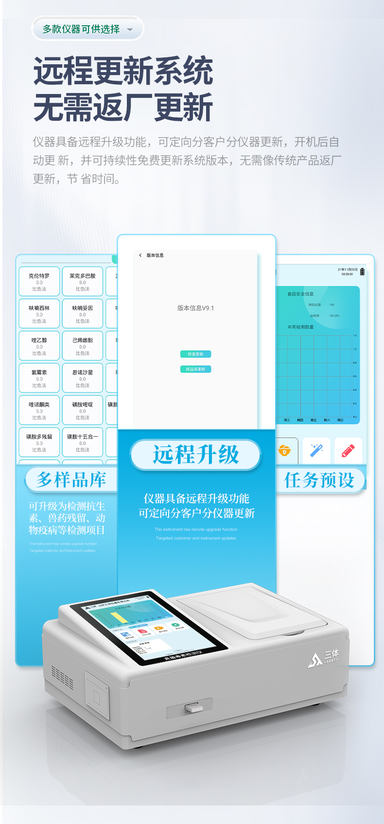 13、儀器具備遠程升級功能,可定向分客戶分儀器更新,開機后自動更新,并可持續性免費更新系統版本,無需像傳統產品返廠更新,節省時間及人力成本并避免了物流運輸返廠升級導致設備損壞的潛在風險。
