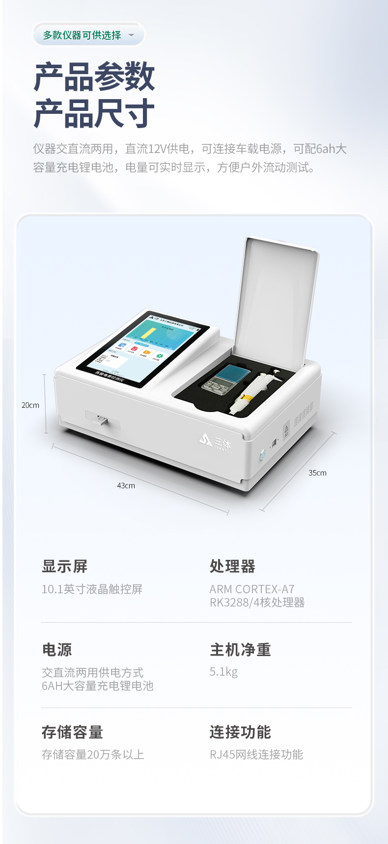 3.一體化臺式快檢設備,采用交直流兩用供電方式,可連接車載電源,配備6ah大容量充電鋰電池,可以滿足現場及流動檢測使用的需求。儀器尺寸:43×35×20cm, 主機凈重:5.1kg